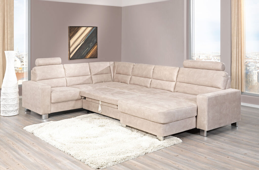 tkanina, barva: bež, mere: 235x336x167 cm. Posteljna funkcija, funkcija počivalnika, vzglavniki in blazine za doplačilo