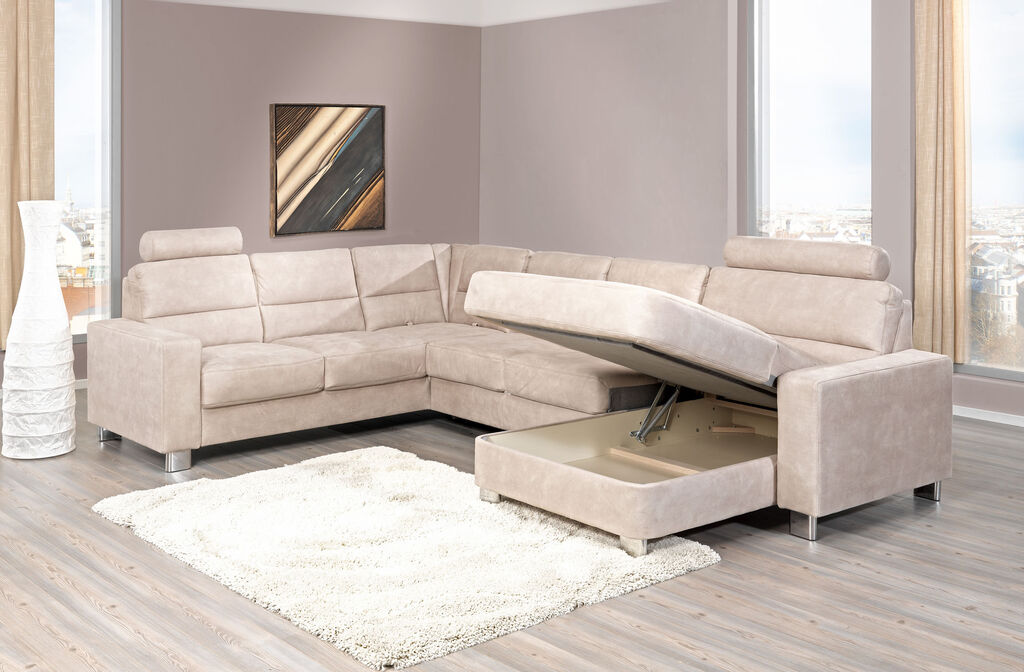 599,00 €tkanina/žamet, naravna barva, vklj. hrbtne blazine, prostorom za shranjevanje in izvlečnim sedežem, mere: 266x150 cm. Okrasne blazine za doplačilo