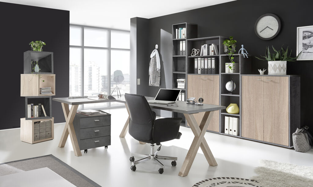 grafit/ dekor: hrast, jej sestavljena iz: pisalne mize, ŠxVxG: 140x210 cm, predalnik na kolesih, ŠxVxG: 45x52x45 cm, regal, ŠxVxG: 81x109x36 cm, regal, ŠxVxG: 81x180x36 cm, regal, ŠxVxG: 41x145x36 cm, regal, ŠxVxG: 41x215x36 cm, in 2nega seta vrat