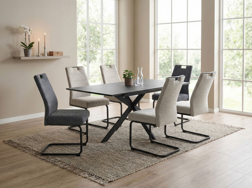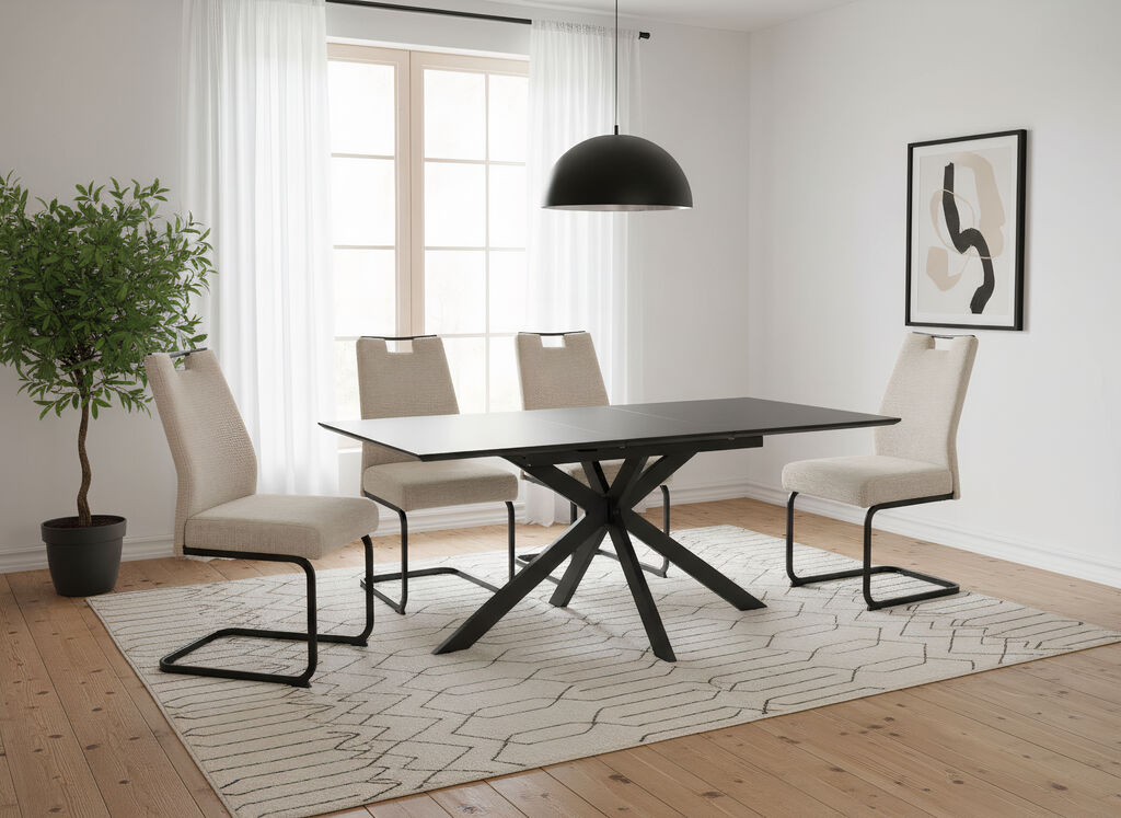 sestavljena iz: mize, steklena plošča v videzu keramike, kovinsko ogrodje: antracit, 140(180)x90 cm, stol, tkanina, antracit, bež, kovinsko ogrodje, črno