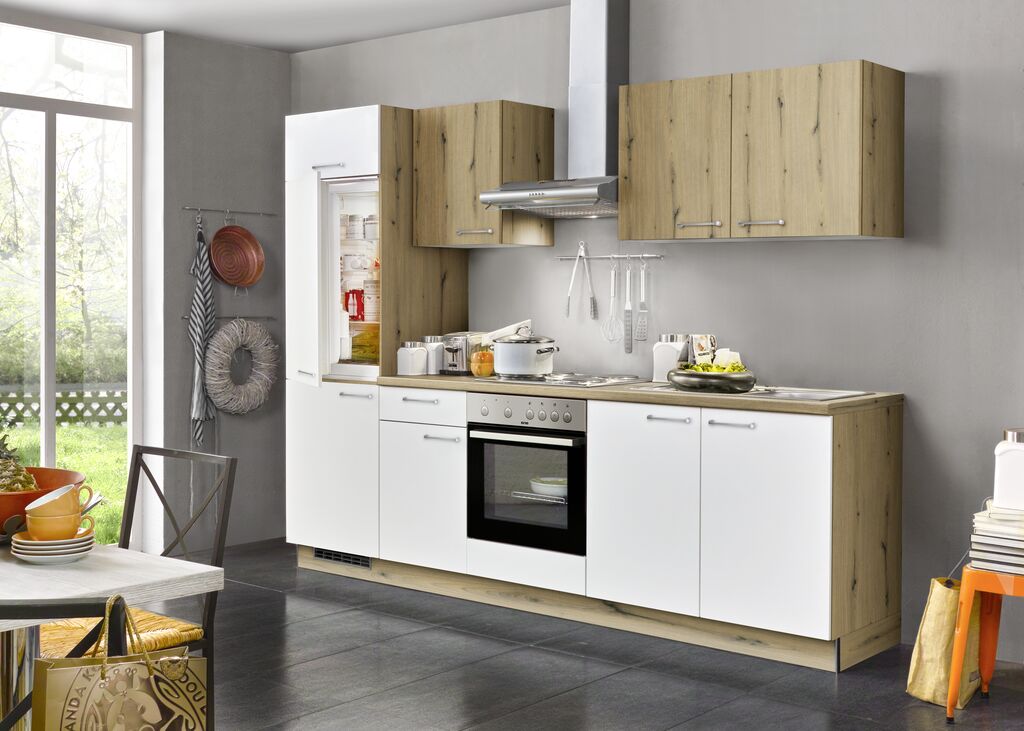 barva: belo motno/hrast astig, 270 cm, na voljo v različnih postavitvah in barvnih kombinacijah. Vgradni aparati ter pomivalno korito za doplačilo