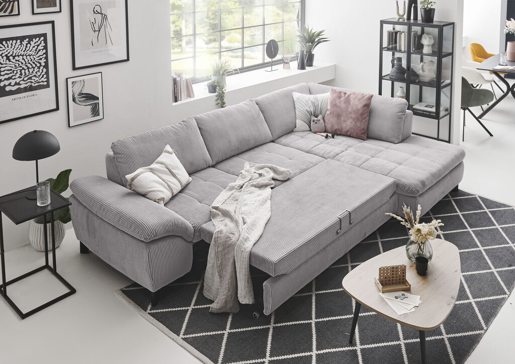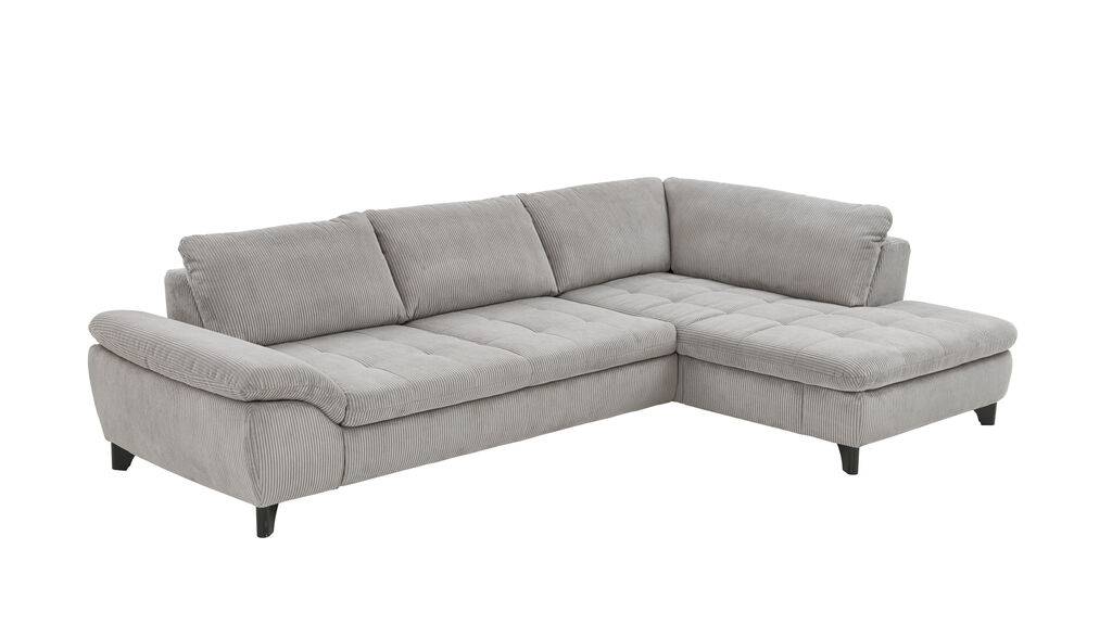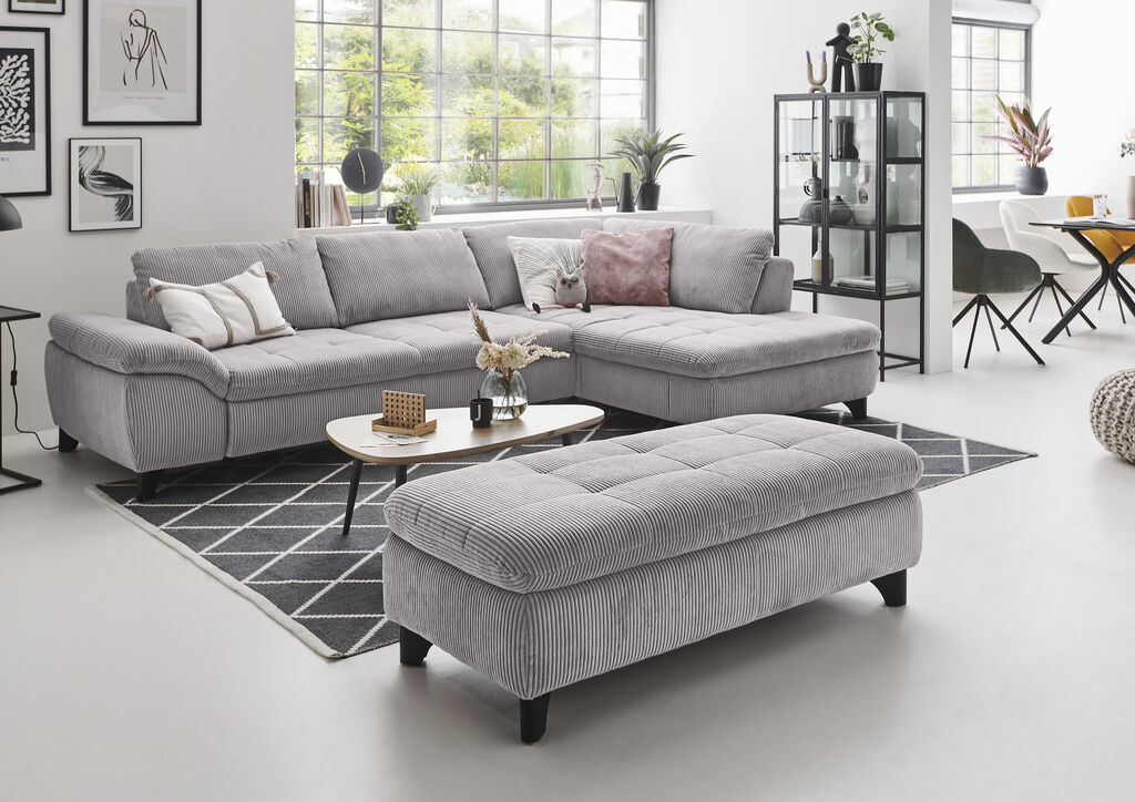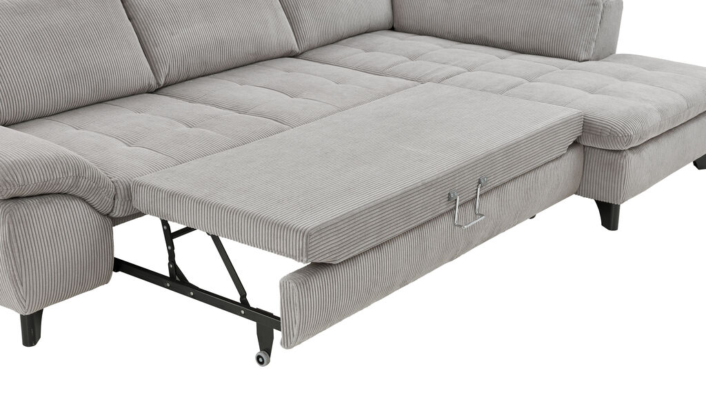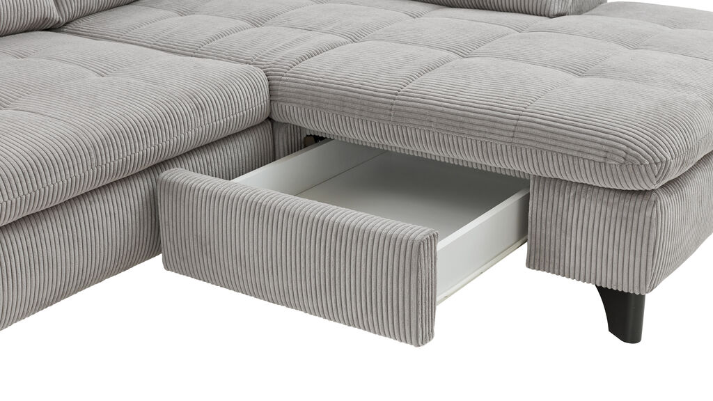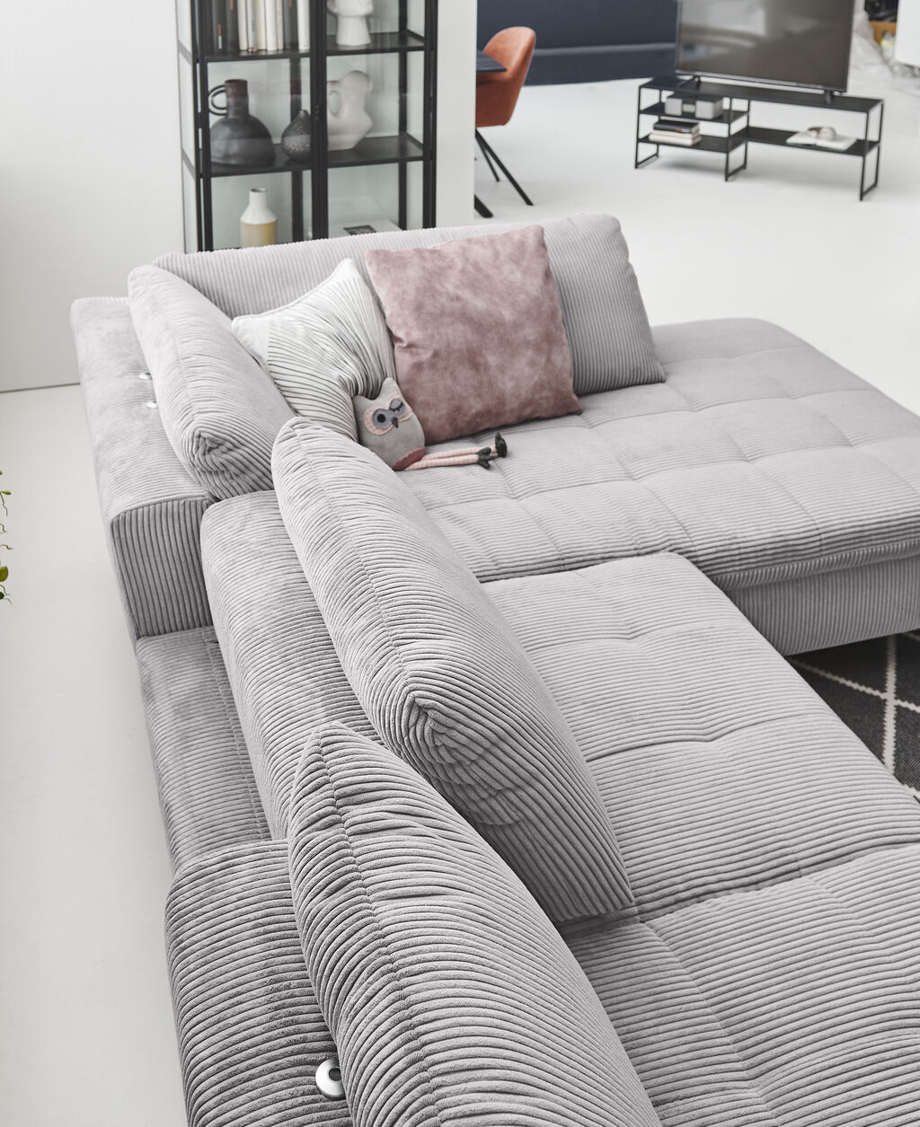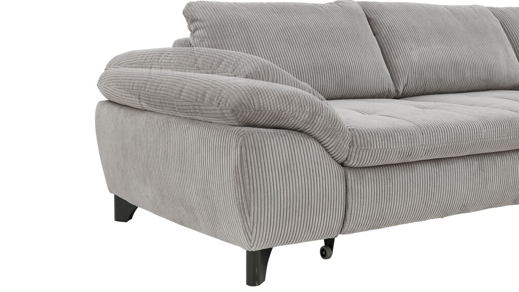 tkanina/žamet, siva, kovinske noge: črne, sedežna višina: 45 cm, mere: 306x197 cm, na voljo v različnih postavitvah in barvnih kombinacijah. Posteljna funkcija, nastavljiva globina sedenja, nastavljivi nasloni za roke, predal, nasloni za glovo, tabure in blazine za doplčilo