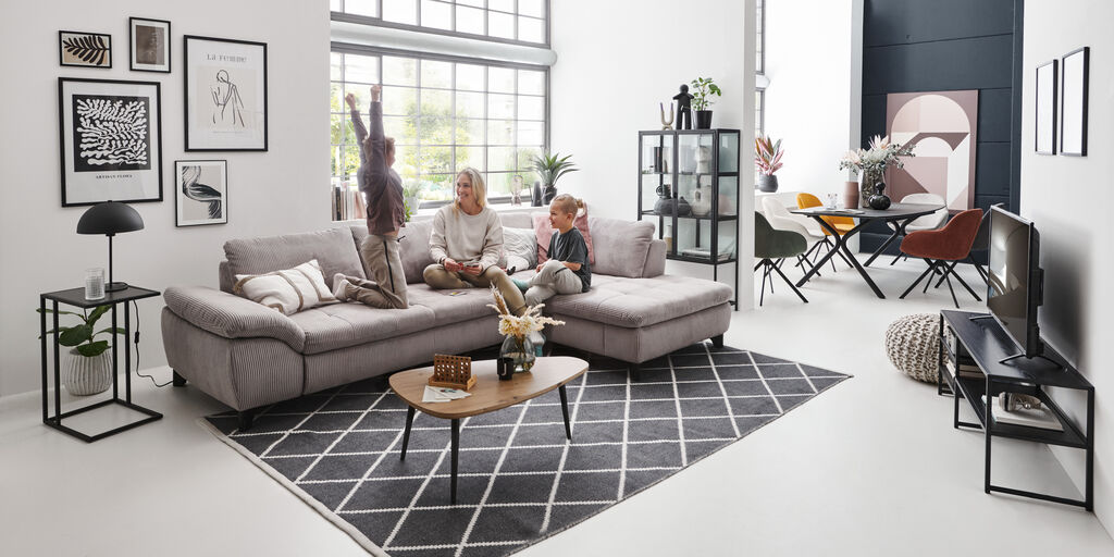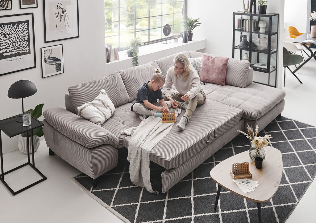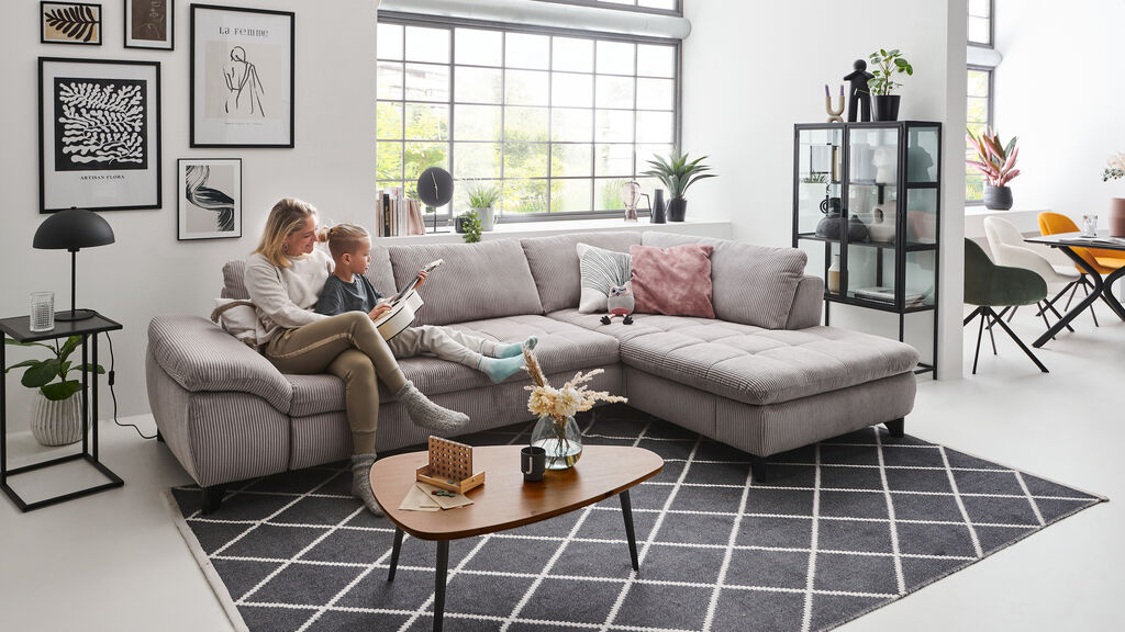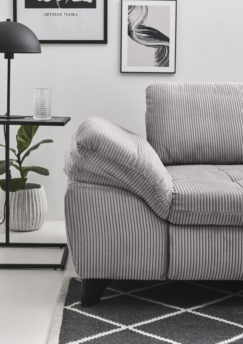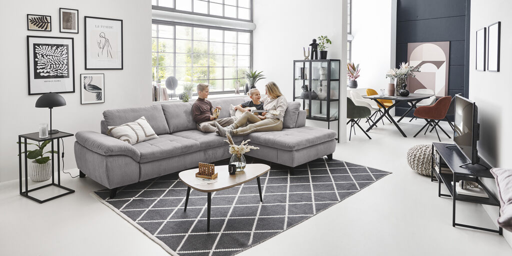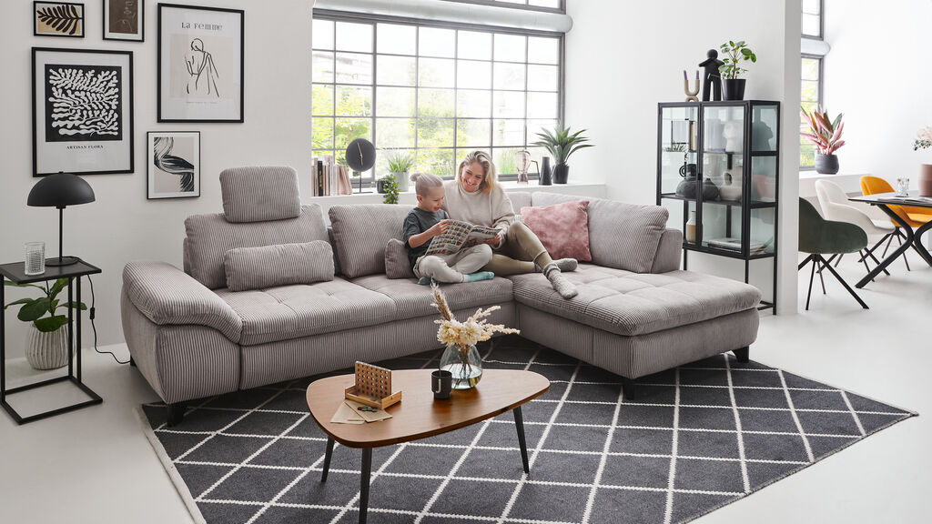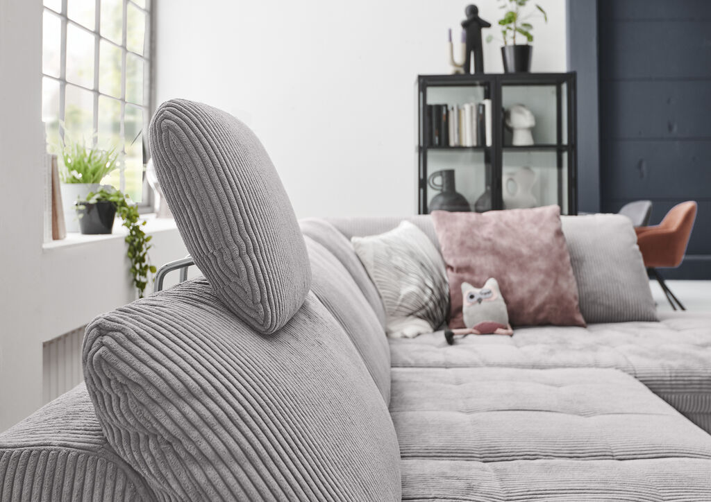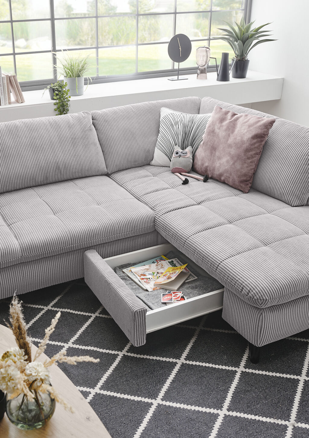 tkanina/žamet, siva, kovinske noge: črne, sedežna višina: 45 cm, mere: 306x197 cm, na voljo v različnih postavitvah in barvnih kombinacijah. Posteljna funkcija, nastavljiva globina sedenja, nastavljivi nasloni za roke, predal, nasloni za glovo, tabure in blazine za doplčilo