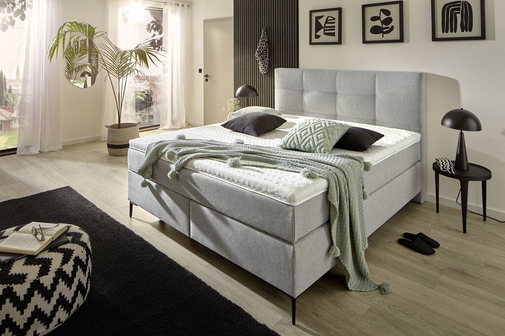 blago: svetlo sivo, noge: kovinske, črne, 180x200 cm, spodnji del: vzmetenje bonell, vklj. vzglavje in vzmetnica z žepkastim jedrom ter nadvložek, na voljo v različnih barvah in velikostih. Dodatki so za doplačilo