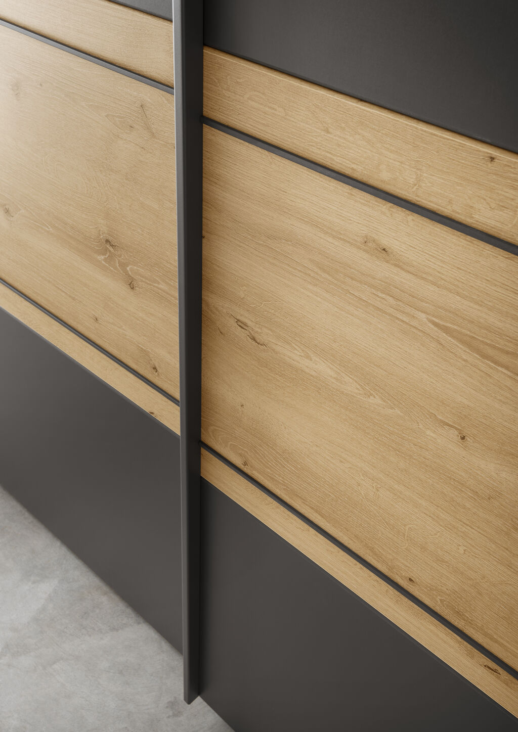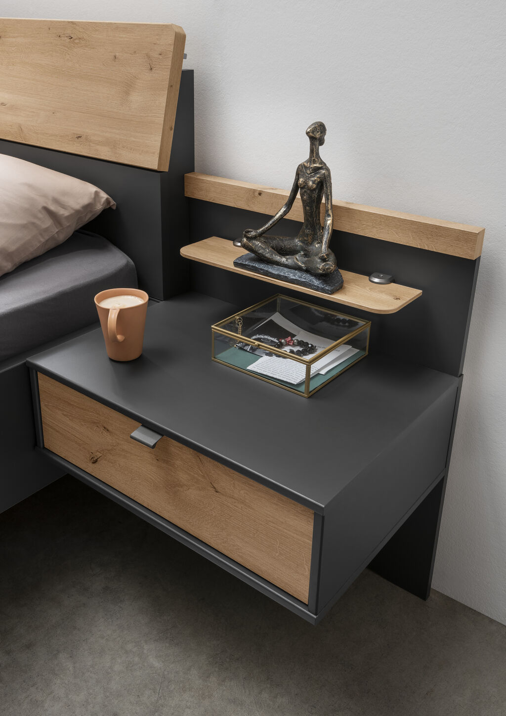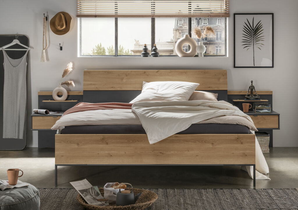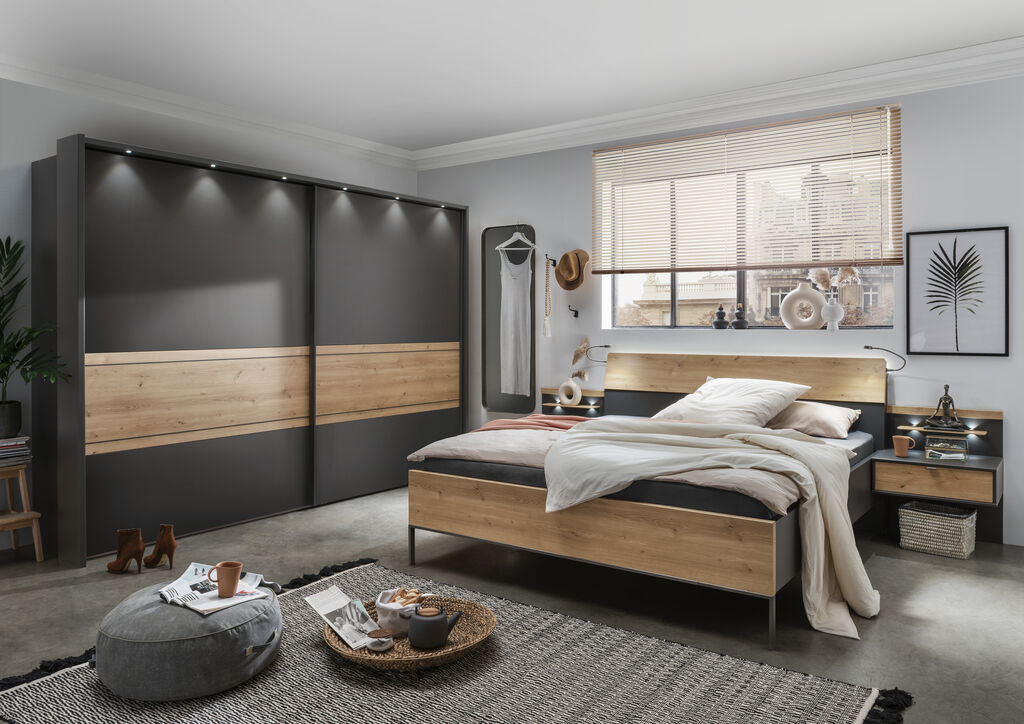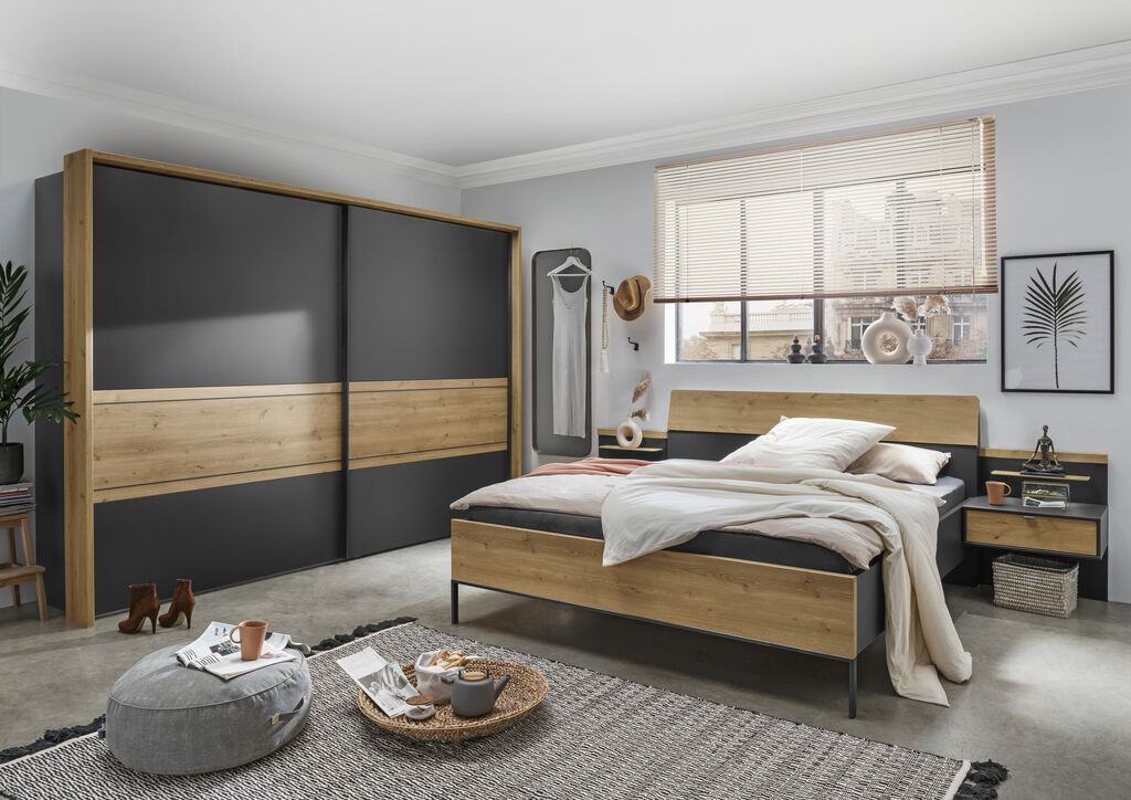 grafit dekor/Bianco hrast, sestavljena iz: omaro z drsnim vrati, 300x217 cm, posteljo, 180x200 cm, par nočnih omaric z 1 predalom, na voljo v različnih barvah in velikostih. Dodatki so za doplačilo