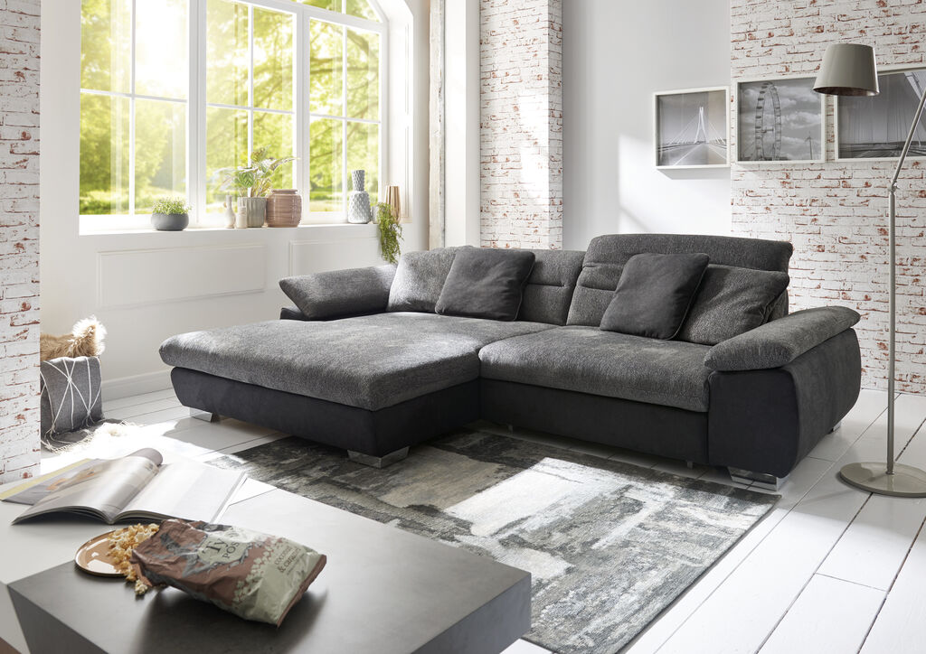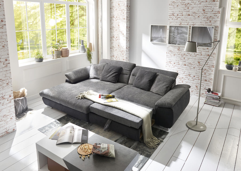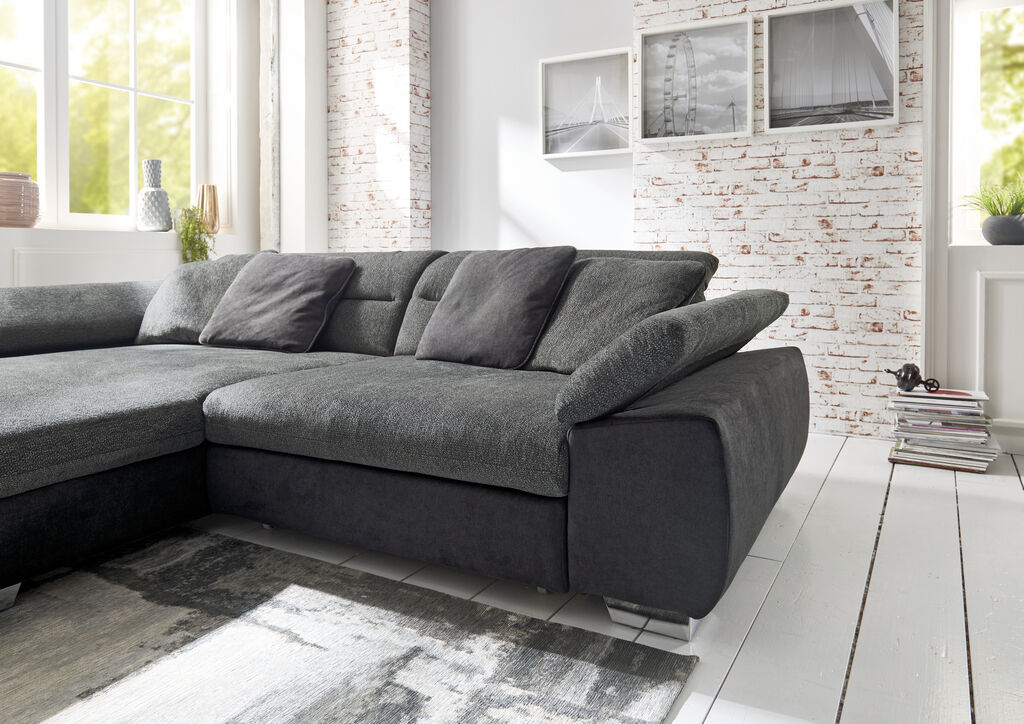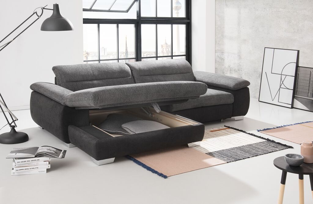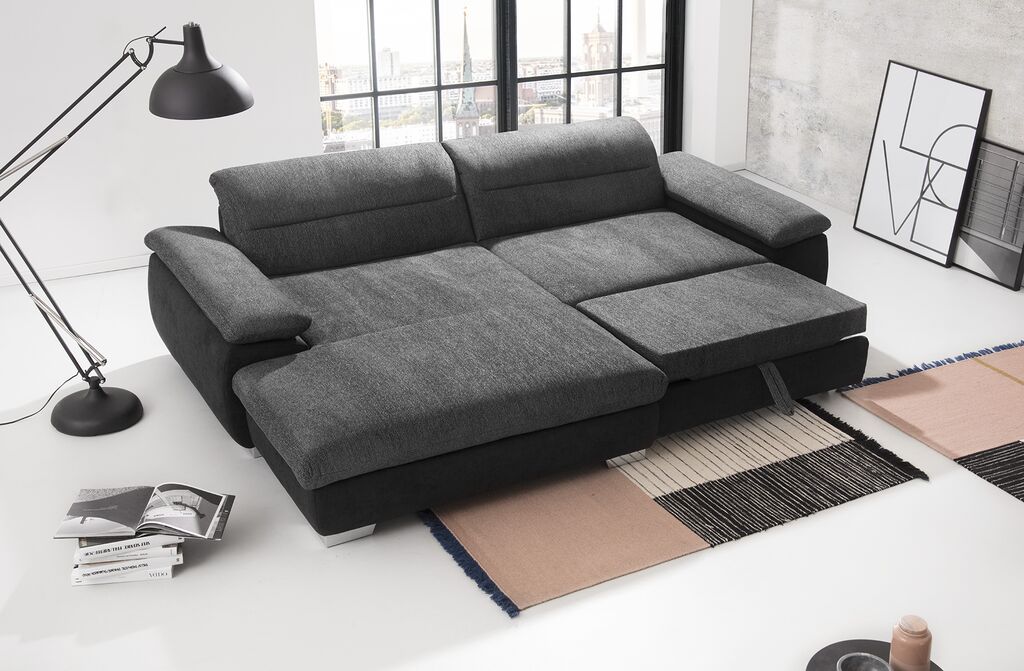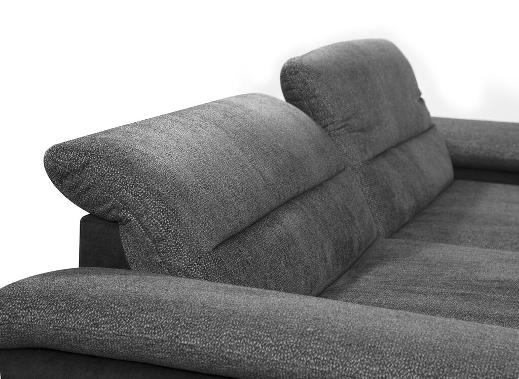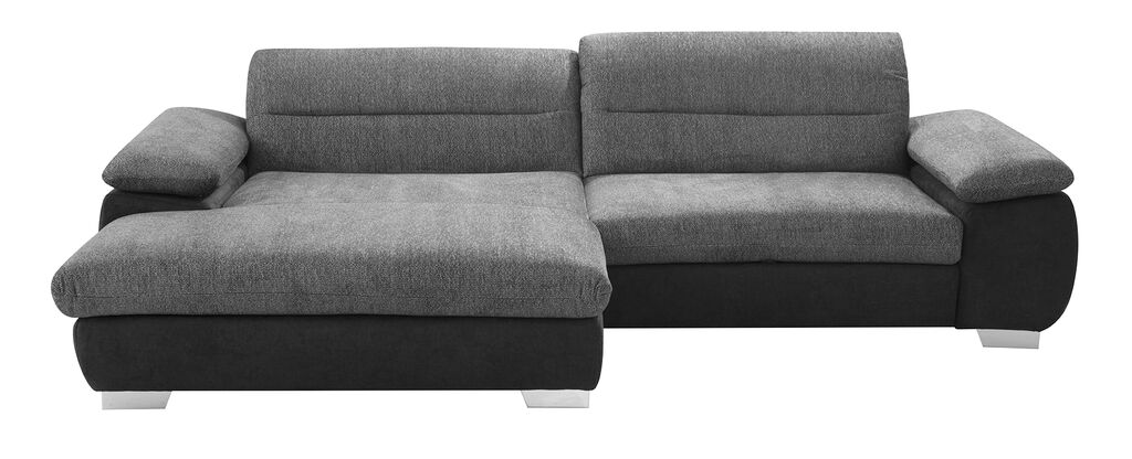 tkanina, antracit, vklj. pravi hrbet, nastavljivi nasloni za glavo in nastavljiva globina sedenja, noge: krom, mere: 200x285 cm, na voljo v različnih postavitvah in barvnih kombinacijah. Dvojno ležišče, predal za posteljnino in nastavljivi nasloni za roke za doplačilo