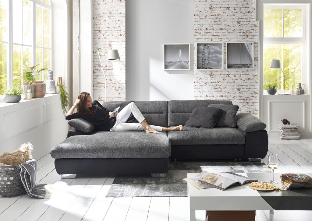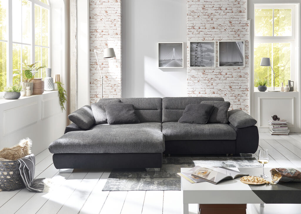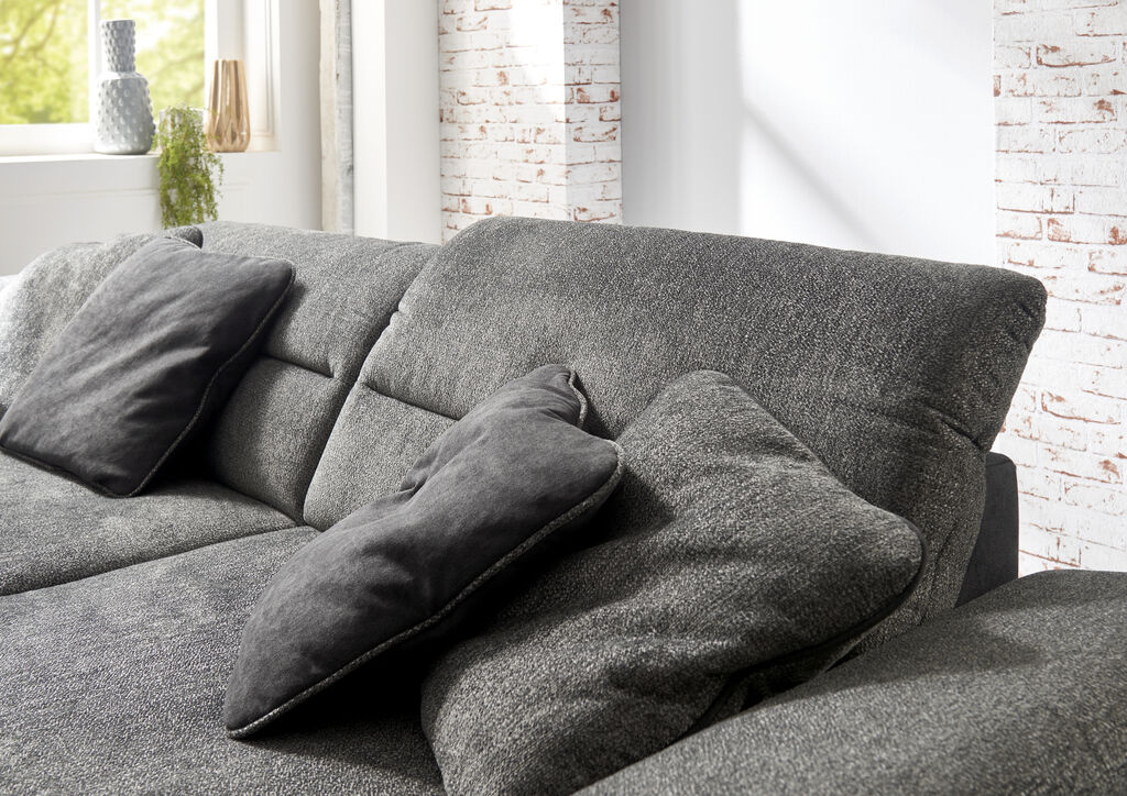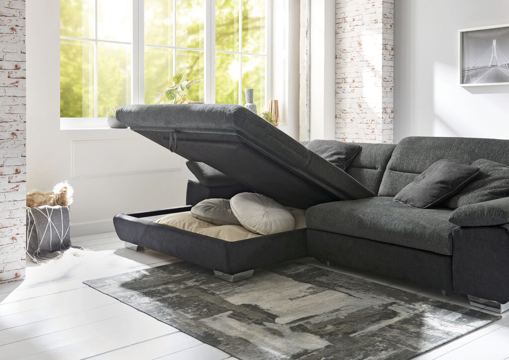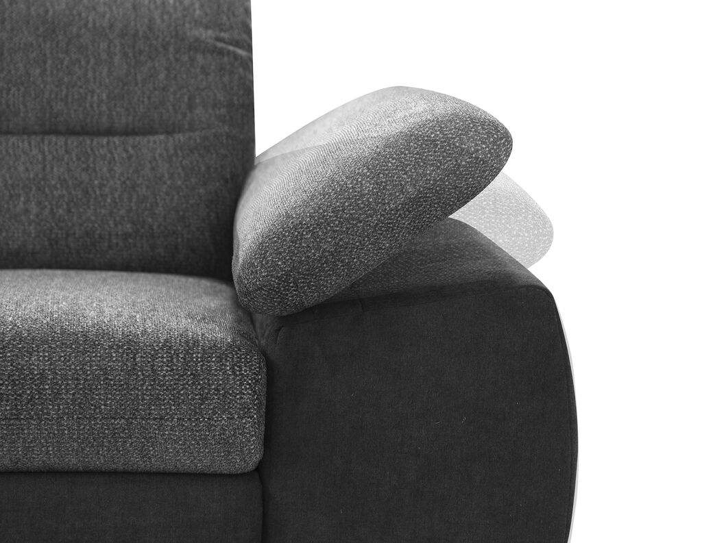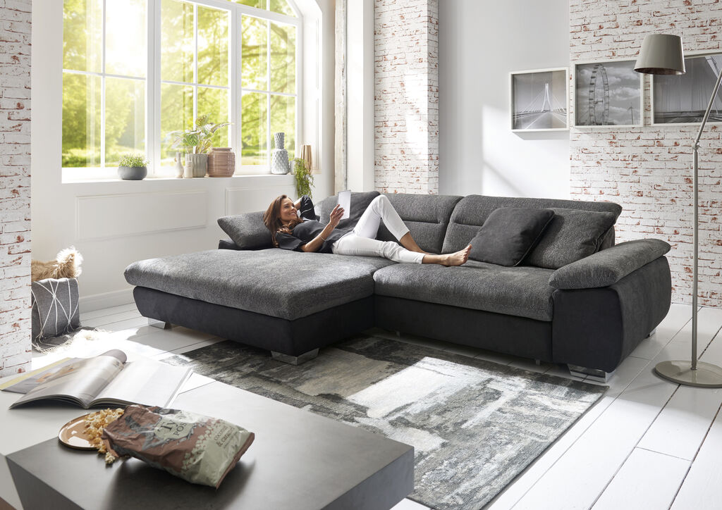 tkanina, antracit, vklj. pravi hrbet, nastavljivi nasloni za glavo in nastavljiva globina sedenja, noge: krom, mere: 200x285 cm, na voljo v različnih postavitvah in barvnih kombinacijah. Dvojno ležišče, predal za posteljnino in nastavljivi nasloni za roke za doplačilo