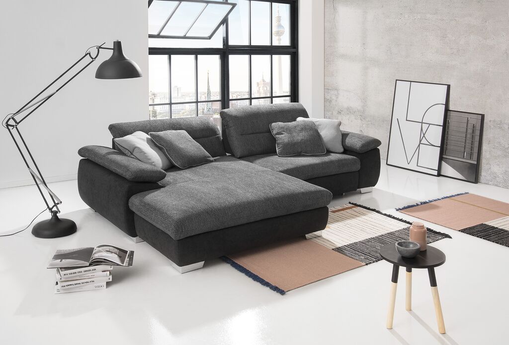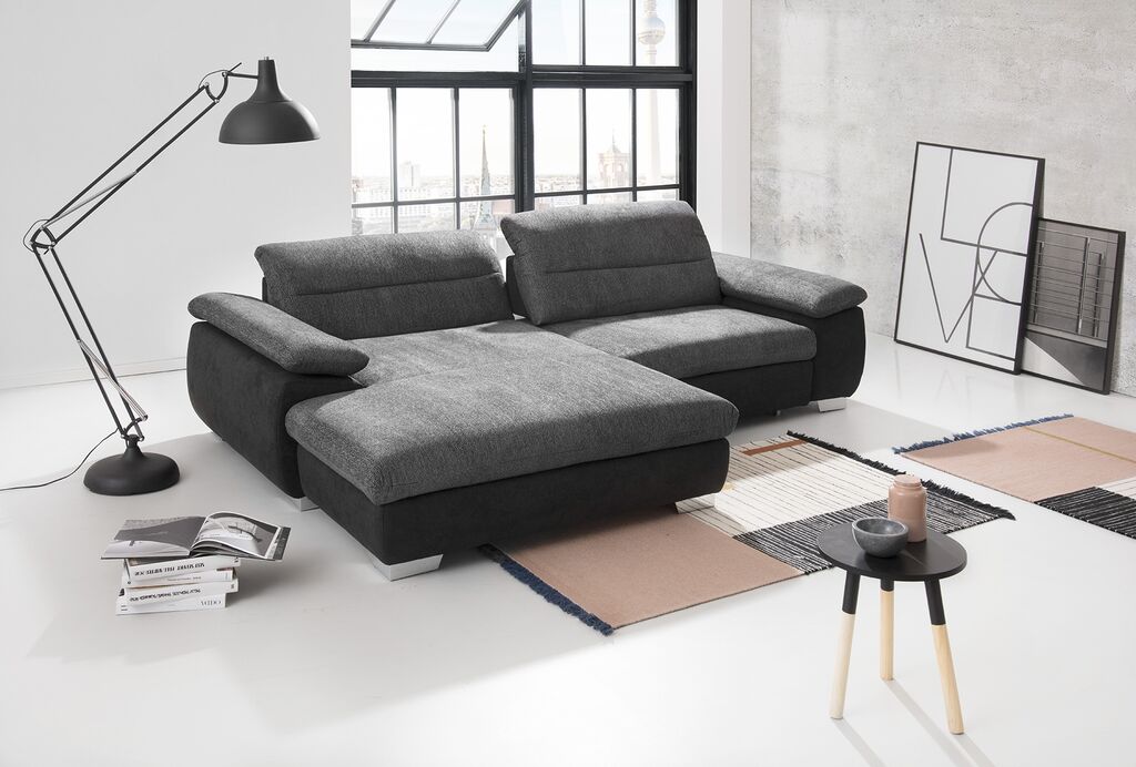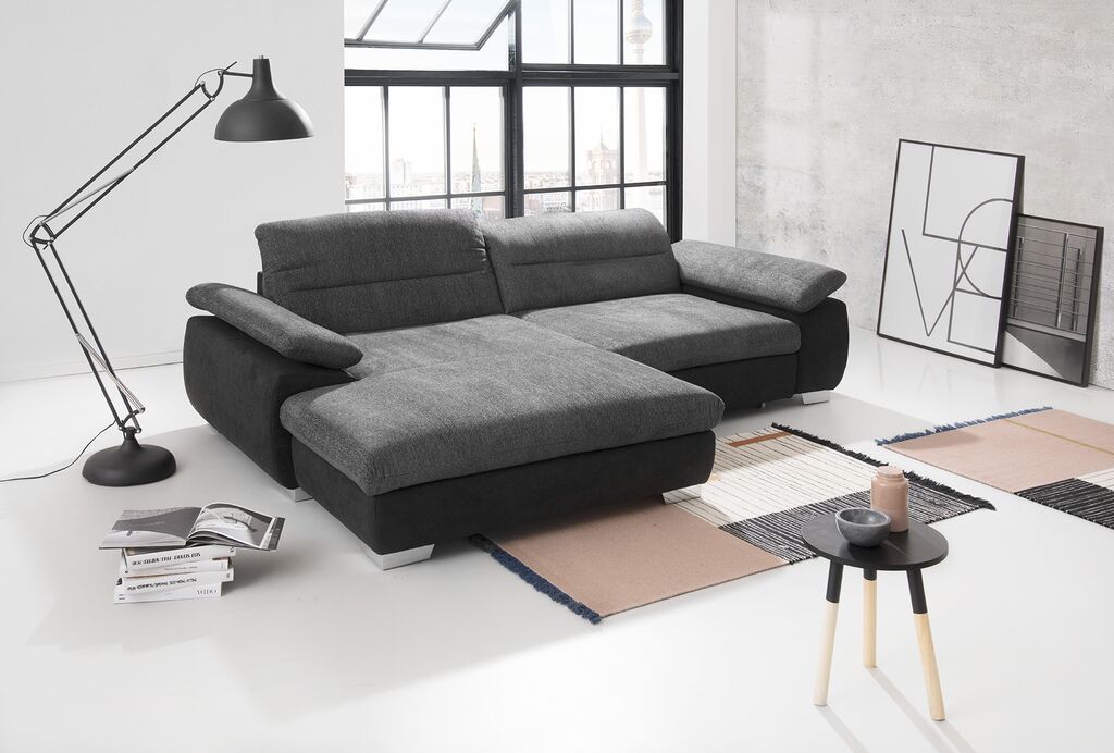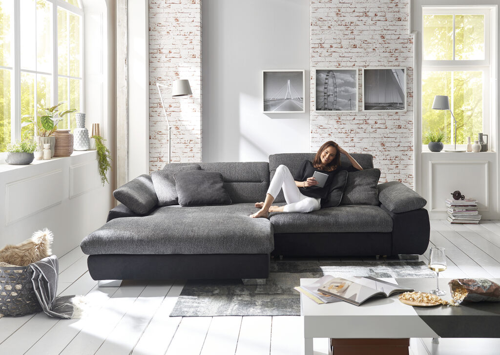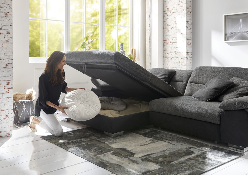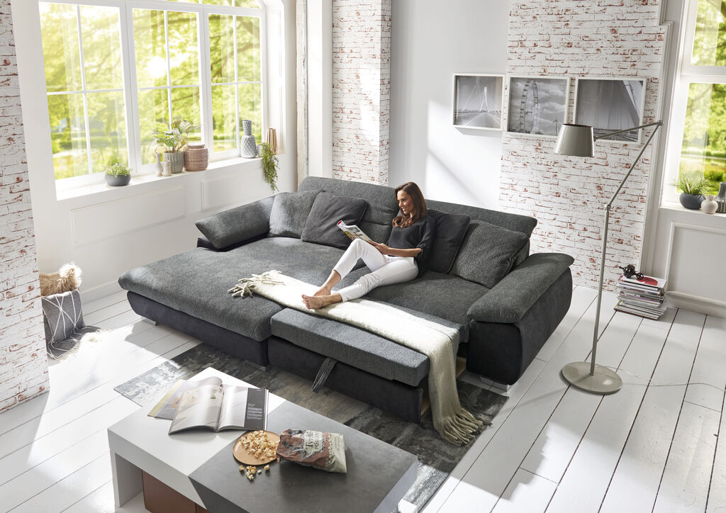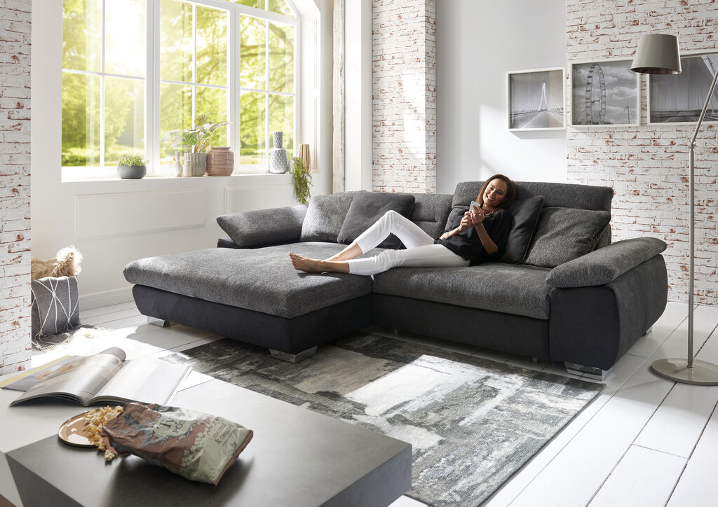 tkanina, antracit, vklj. pravi hrbet, nastavljivi nasloni za glavo in nastavljiva globina sedenja, noge: krom, mere: 200x285 cm, na voljo v različnih postavitvah in barvnih kombinacijah. Dvojno ležišče, predal za posteljnino in nastavljivi nasloni za roke za doplačilo