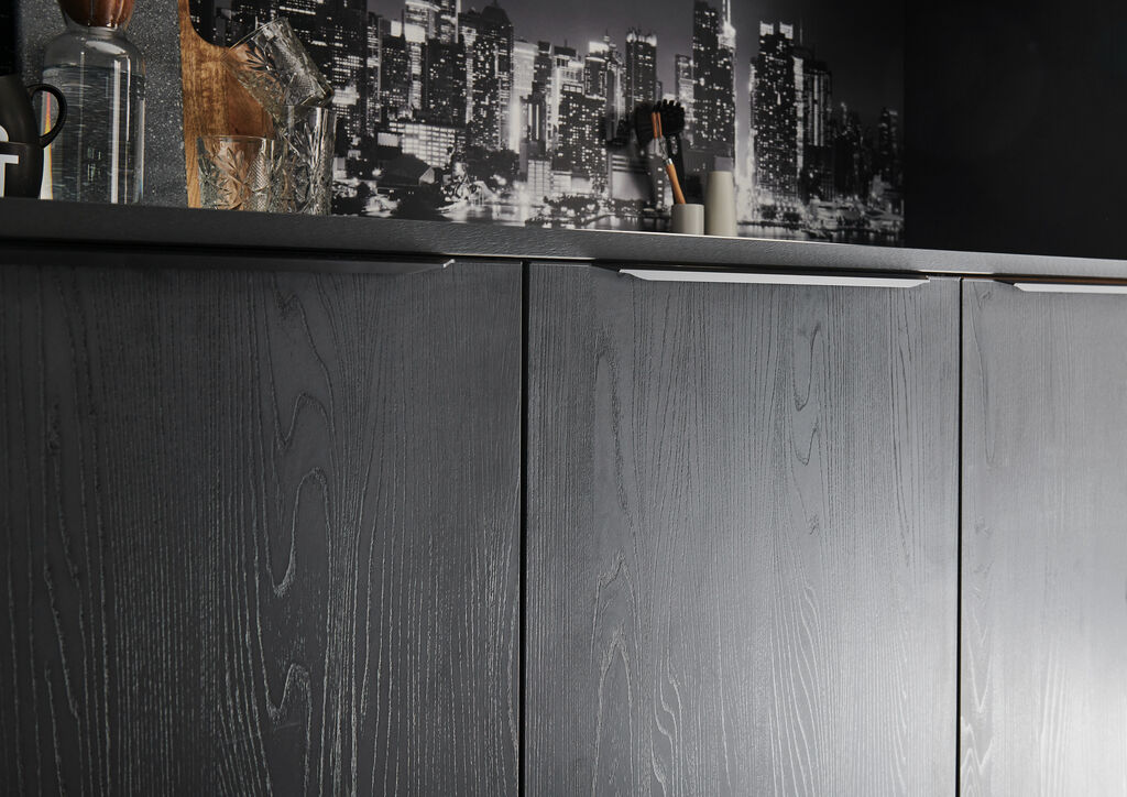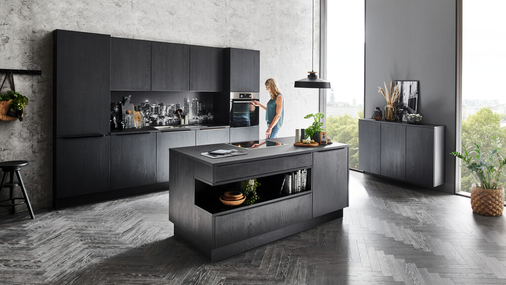 barva: hrast Nero, ca. 300+150+185, na voljo v različnih postavitvah in barvnih kombinacijah. Vgradni aparati ter pomivalno korito za doplačilo