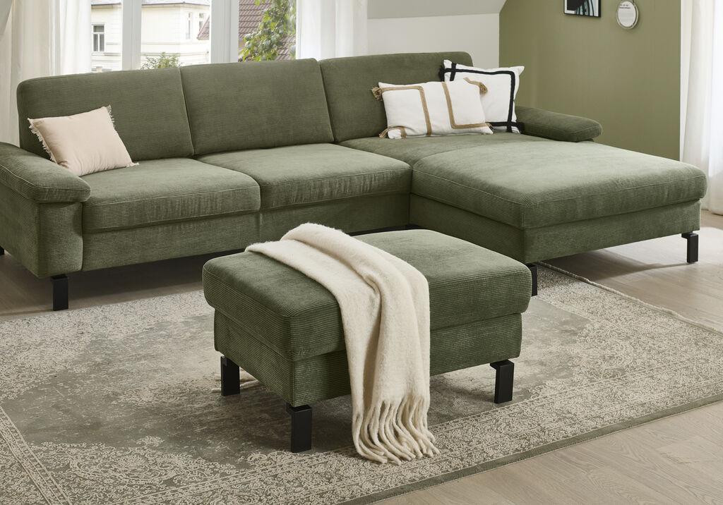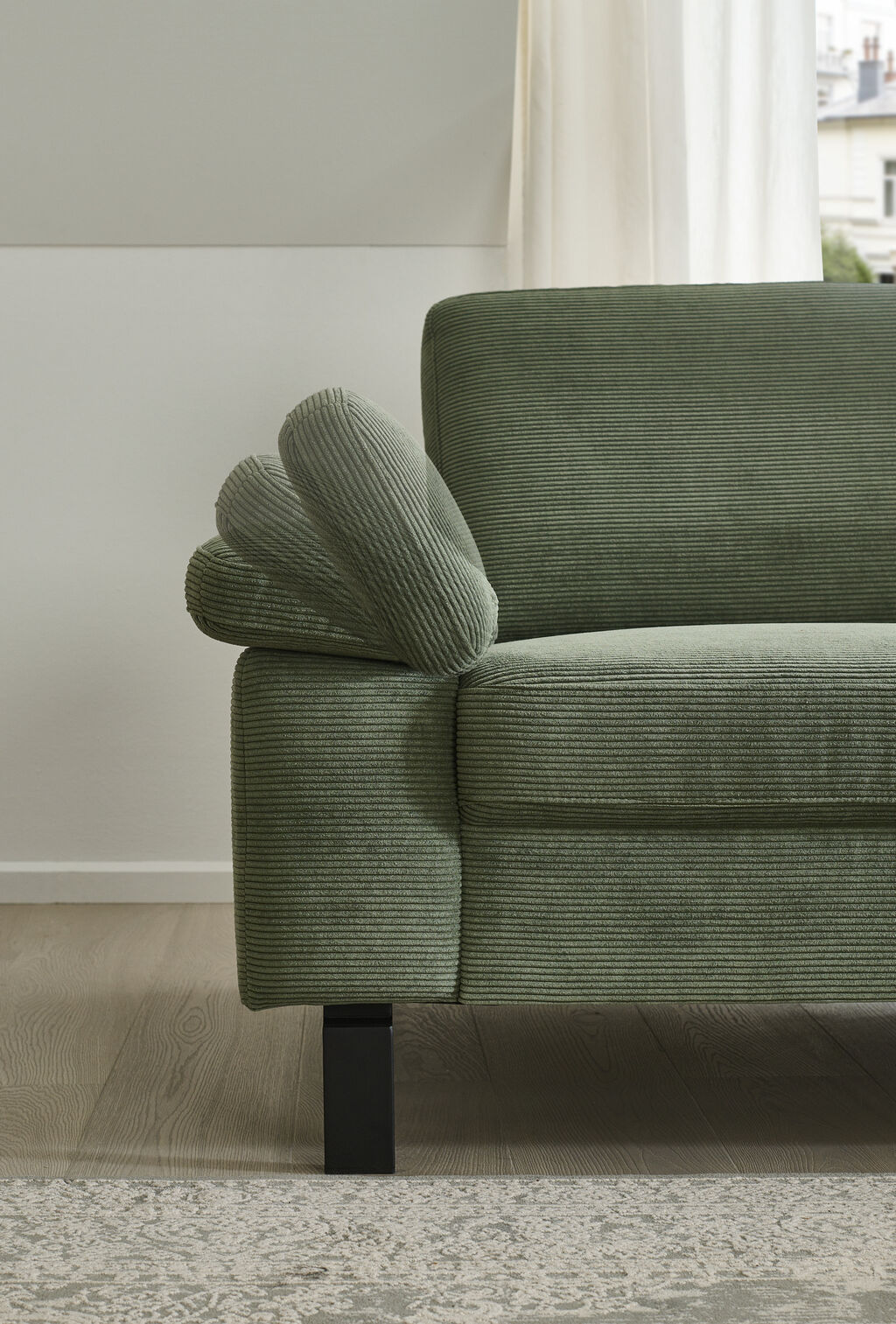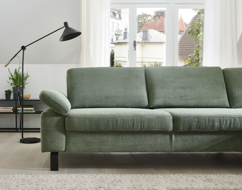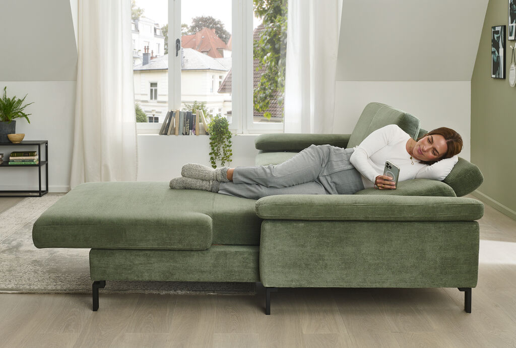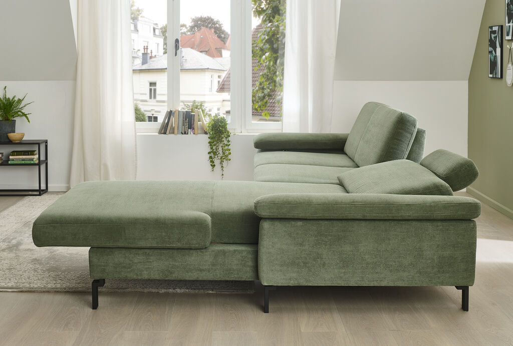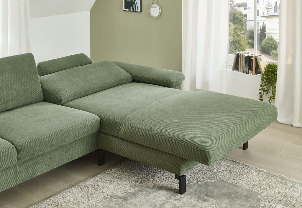 tkanina/žamet, olivna barva, noge: mat/črne, sedežna izvedbah: vzmetno jedro, vklj. z zložljivimi nasloni za roke, mere: 304x185 cm, na voljo v različnih postavitvah in barvnih kombinacijah. Posteljna funkcija, nasloni za glavo in blazine za doplačilo