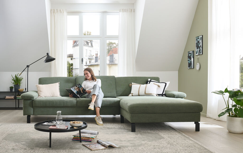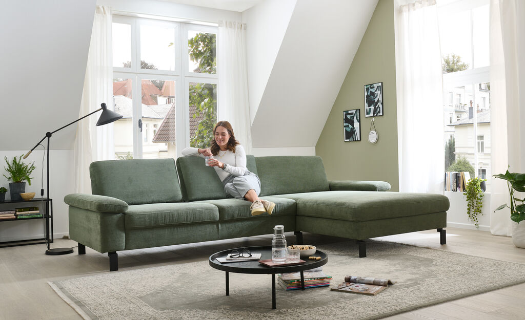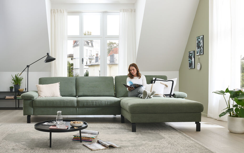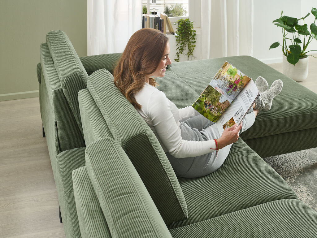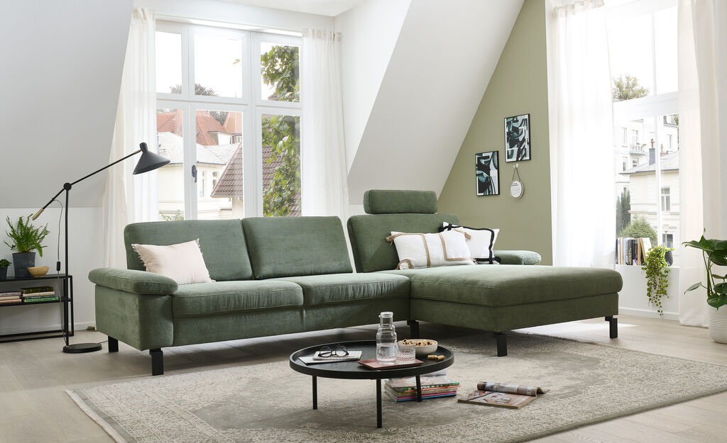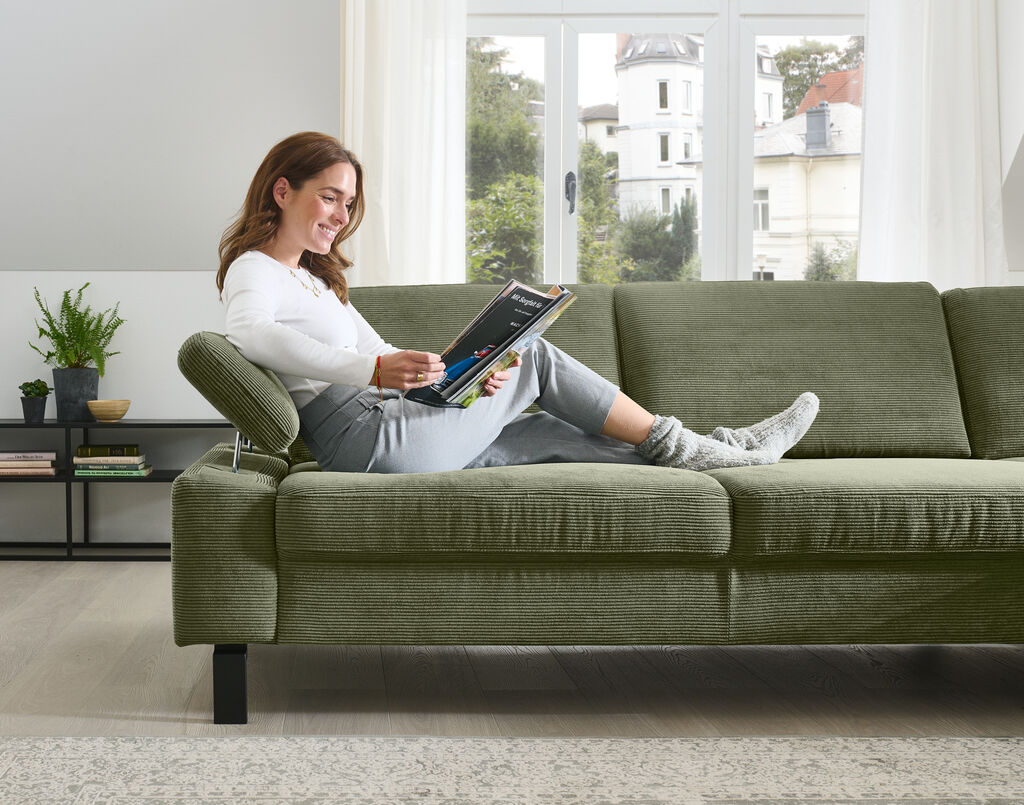 tkanina/žamet, olivna barva, noge: mat/črne, sedežna izvedbah: vzmetno jedro, vklj. z zložljivimi nasloni za roke, mere: 304x185 cm, na voljo v različnih postavitvah in barvnih kombinacijah. Posteljna funkcija, nasloni za glavo in blazine za doplačilo