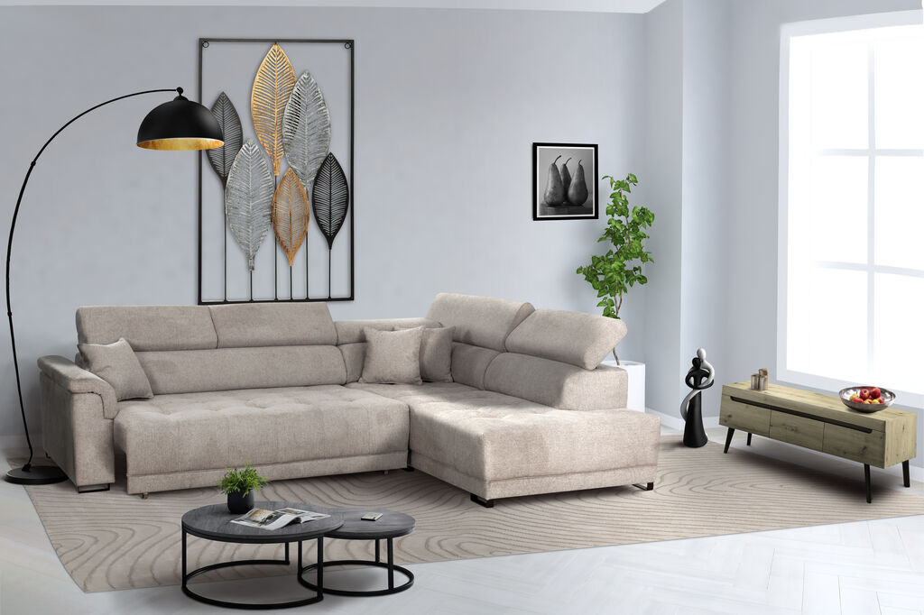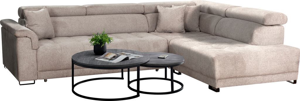tkanina, svetlo siva, vklj. nastavljivi nasloni za glavo, mere: 300x224 cm, na voljo v različnih postavitvah in barvnih kombinacjah. Nastavljiva globina sedenja in blazine za doplačilo