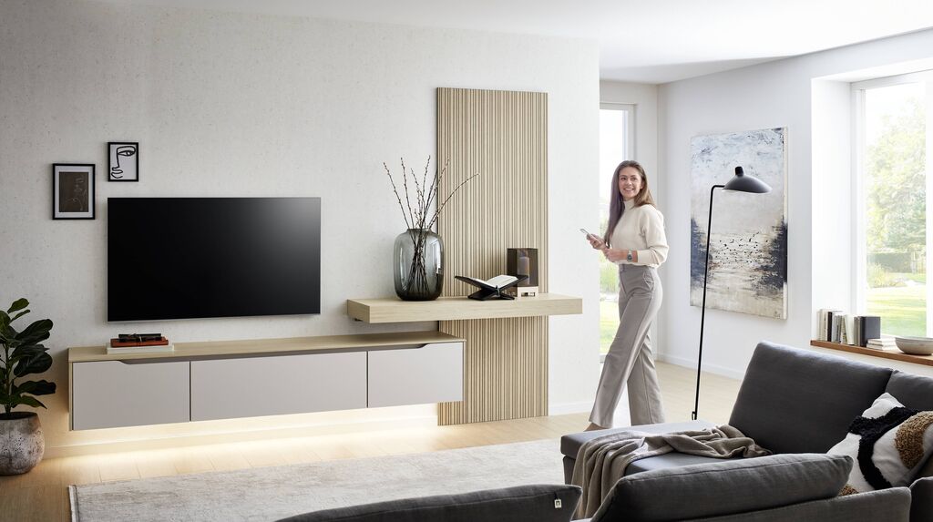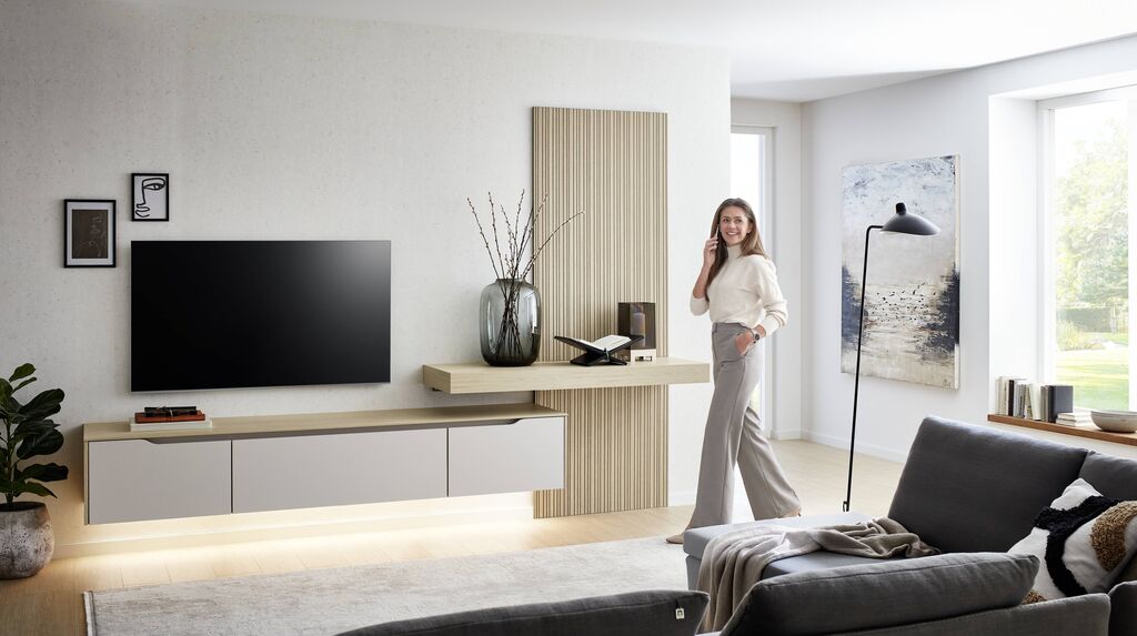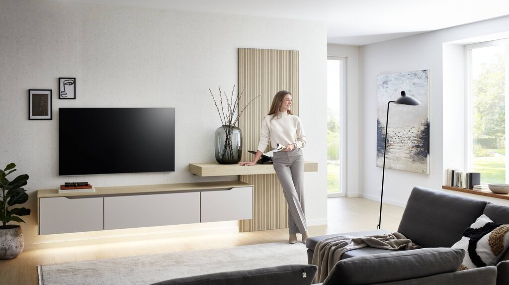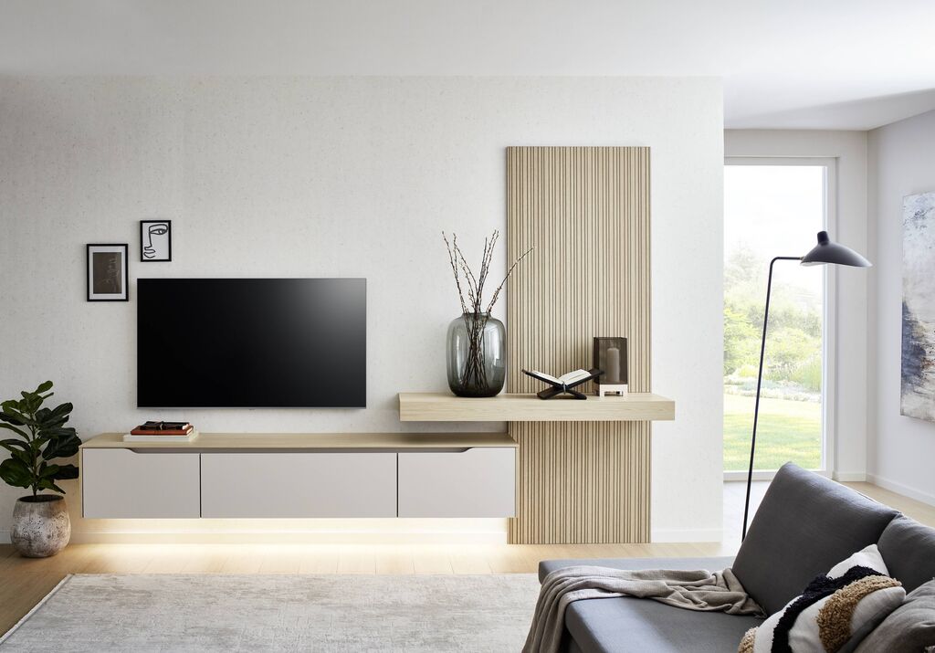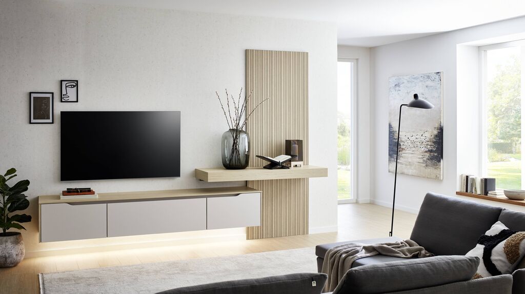peščena barva ultra mat/Stripwood light, širina: 270 cm, z vdolbenim ročajem, na voljo v različnih postavitvah in velikostih. Izvlečni predal, LED osvetljava, prhod kablov in izrez za delovno površino za doplačilo