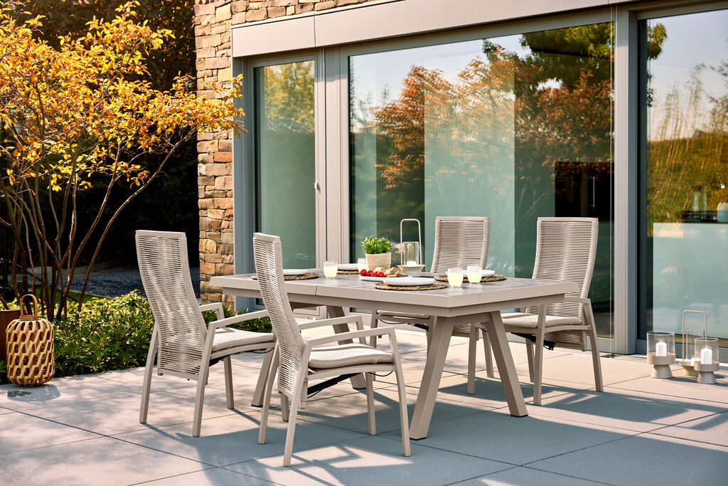 aluminijasto ogrodje, taupe, V-noge, mizna plošča: Sintered Stone, bež, ŠxGxV: 200/260x100x77 cm