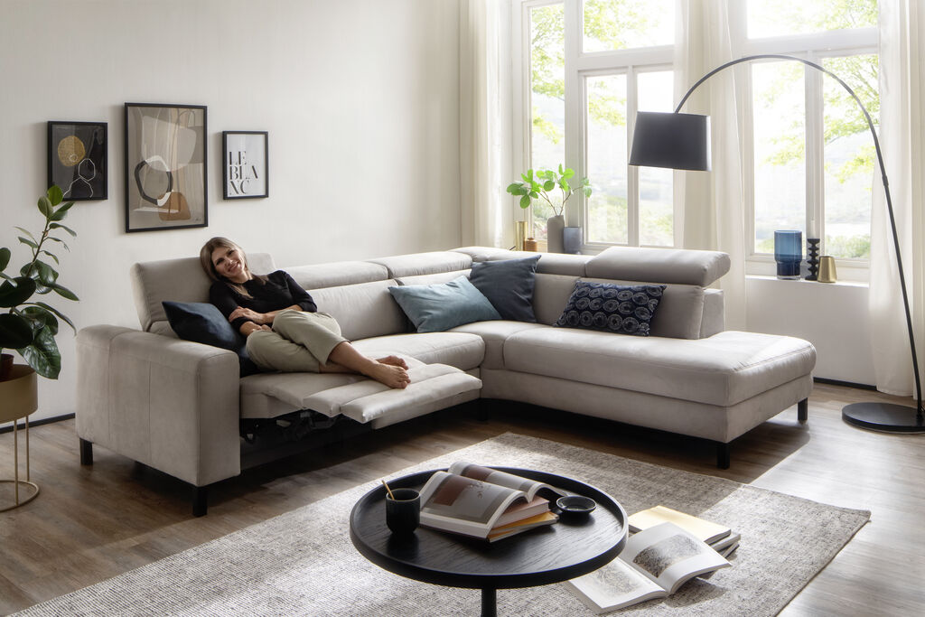 tkanina, naravna barva, vklj. nastavljivi nasloni za glavo, mere: 286x240 cm, na voljo v različnih postavitvah in barvnih kombinacijah. Motorizirana relaks funkcija in blazine za doplačilo