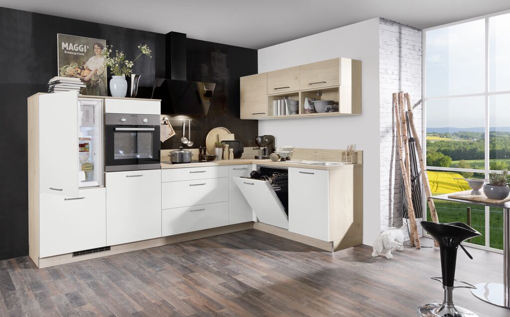 barva: bela visok sijaj/hrast naravni, 305x185 cm, na voljo v različnih postavitvah in barvnih kombinacijah. Vgradni aparati ter pomivalno korito za doplačilo