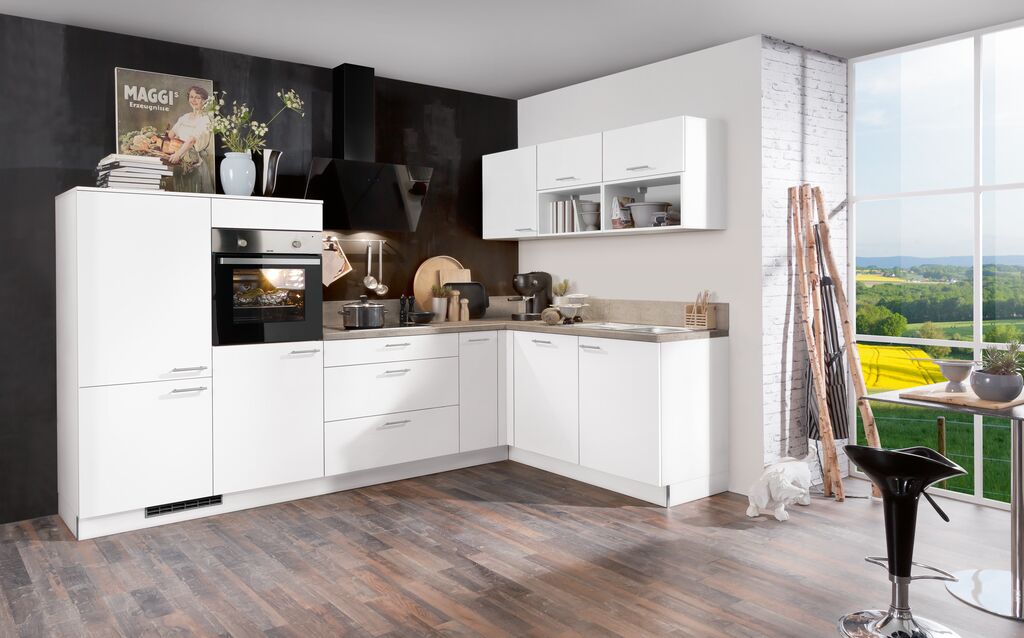 barva: bela, 305x185 cm, na voljo v različnih postavitvah in barvnih kombinacijah. Vgradni aparati ter pomivalno korito za doplačilo