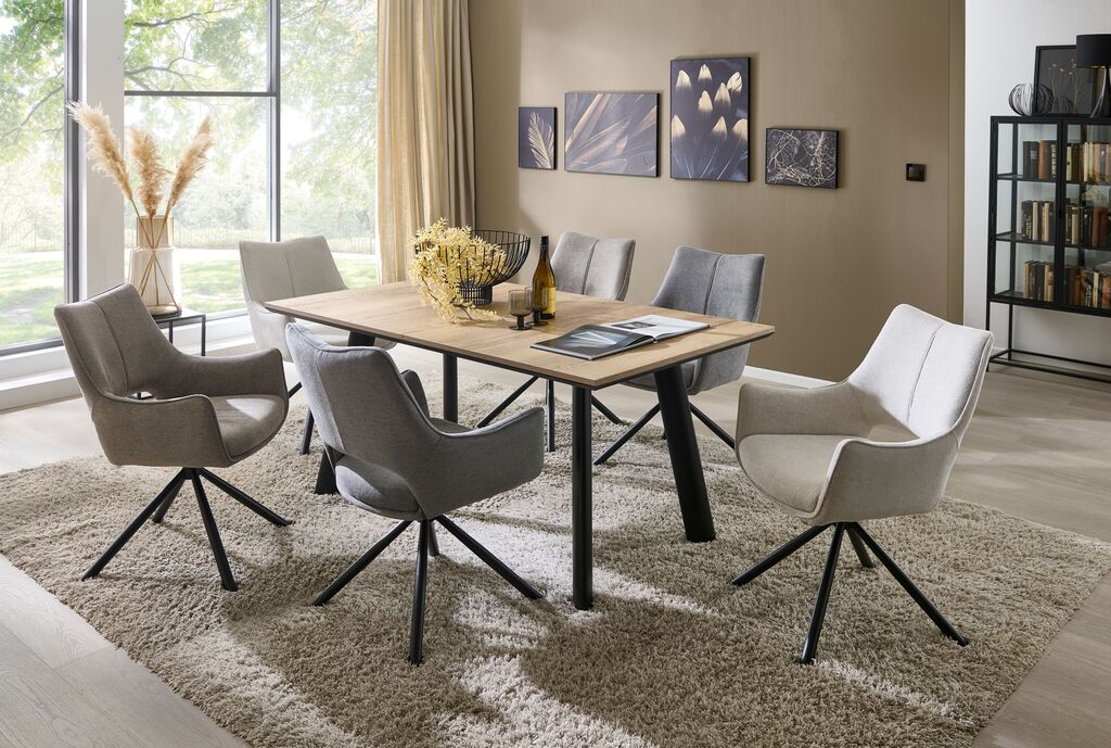 sestavljena iz: mize, dekor: hrast, kovinsko ogrodje: črno, 160(240)x90 cm, stol, tkanina; rjavo-siva, kovinsko ogrodje: črno, vrtljiv za 360° drehbar, z nasloni za roke, na voljo v različnh barvah