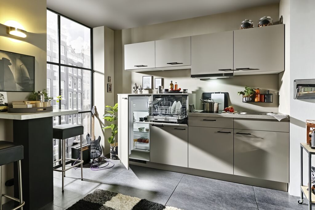 barva: motno krem siva, 240 cm, vklj. z vsemi navedenimi inoks električnimi aparati, na voljo v različnih postavitvah in barvnih kombinacijah. Pečica ter pomivalno korito za doplačilo, 204908 gratis Candy aparati: - Hi-Light steklokeramična kuhalna plošča - pomivalni stroj, energijski razred F - napa, energijski razred B - hladilnik, energijski razred E