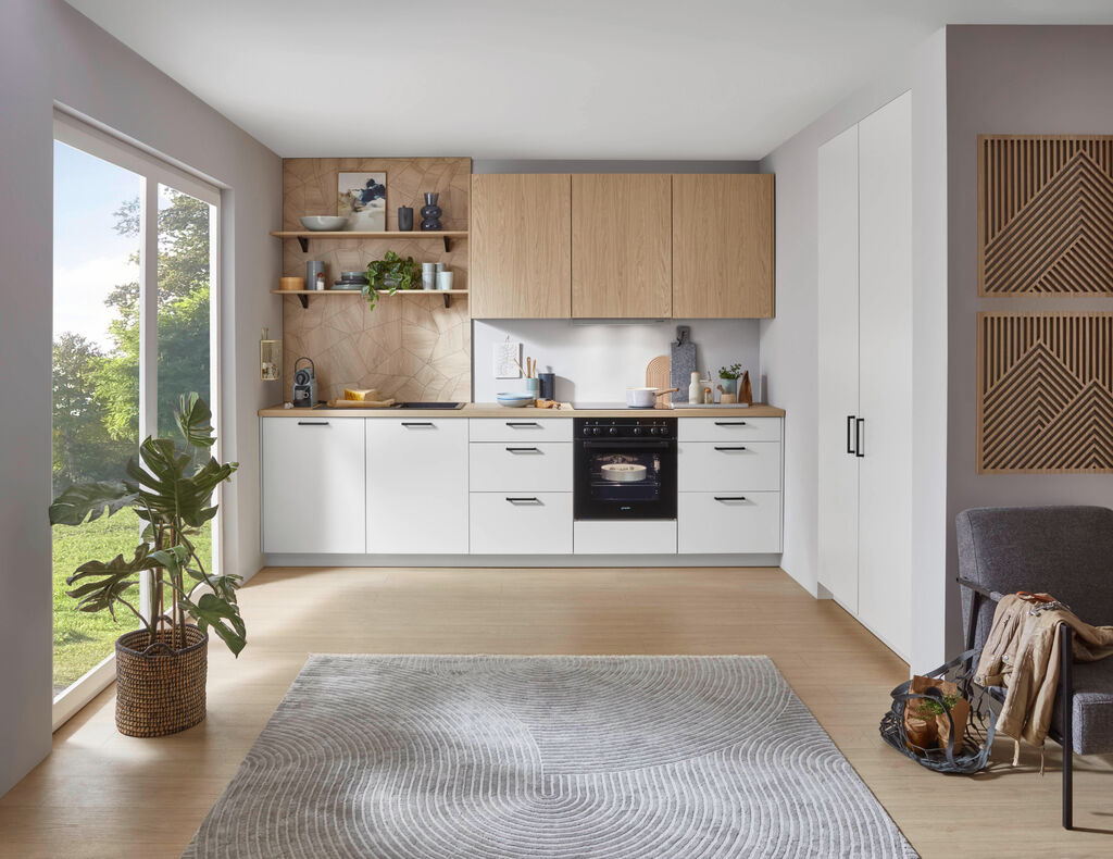 barva: bela/hrast Como, 303+120cm, na voljo v različnih postavitvah in barvnih kombinacijah. Vgradni aparati ter pomivalno korito za doplačilo
