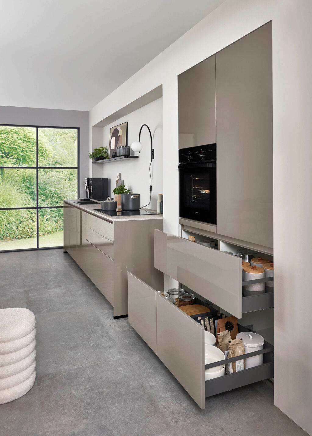 barva: siva Taupe visok sijaj, ca.303 cm + 120 cm, na voljo v različnih postavitvah in barvnih kombinacijah. Vgradni aparati ter pomivalno korito za doplačilo
