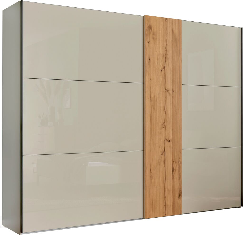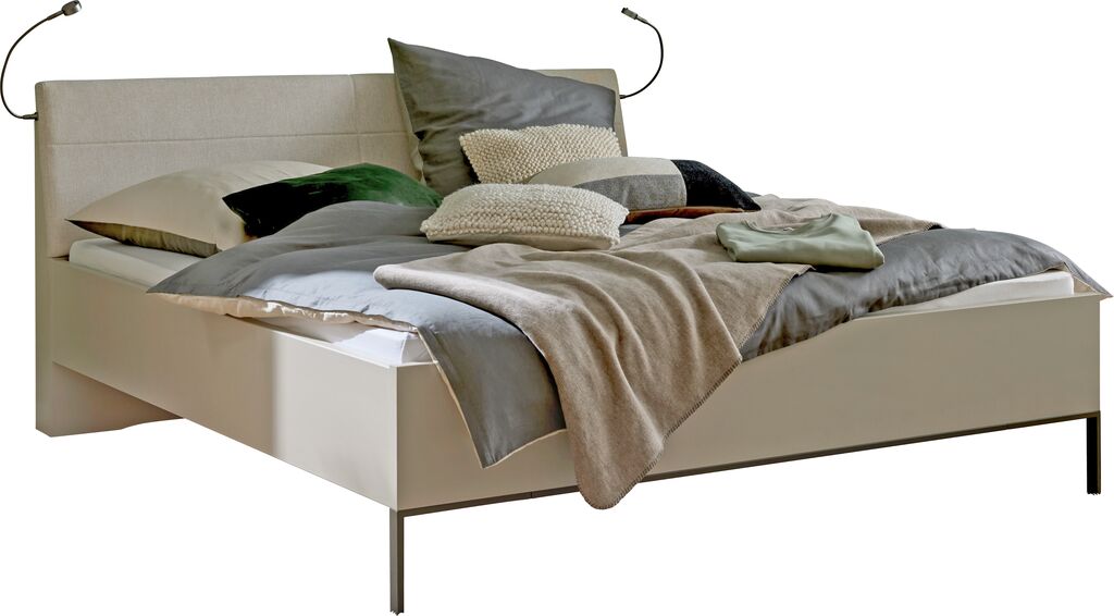 šampanjec/furnir, cenovni primer za: 2-delno omaro, ročaji: sivi, ŠxVxG: 250x217x67 cm, postelje, 180x200 cm, oblazinjeno vzglavje, noge: sive, in nočnih omaric, 1 predal, ŠxVxG: 60x48x43 cm, na voljo v različnih velikostih. Komoda, osvetlitev in dodatki za doplačilo