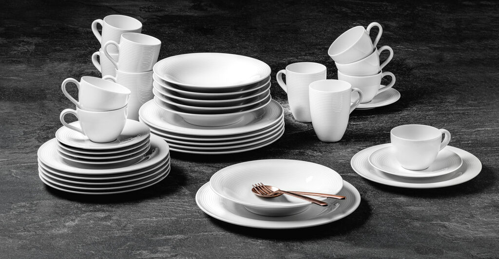36-delni, sestavljen iz: 6x kavne skodelice 0,26 l, 6x krožnik 16,5 cm, 6x krožnik 23 cm, 6x krožnik 27,5 cm, 6x jušni krožnik 22,5 cm, 6x skodelica z ročajem, porcelan, primerna za pomivalni stroj in mikrovalovno pečico