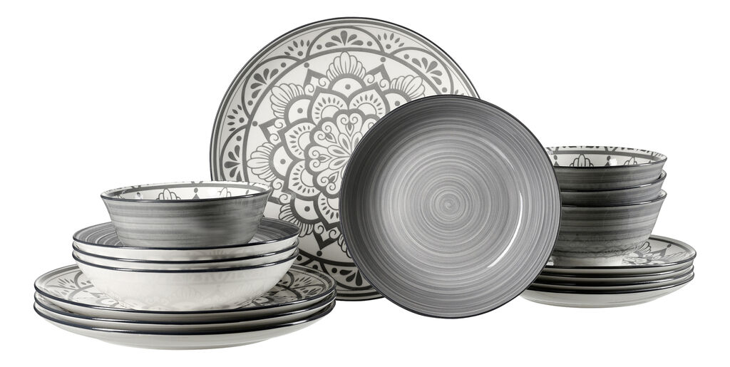 16-delni, sestavljen iz: 4x krožnik za zajtrk 21 cm, 4x krožnik 27 cm, 4x jušni krožnik, 4x skleda 15,5 cm, siva, porcelan, primerno za pomivalni stroj