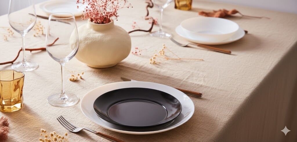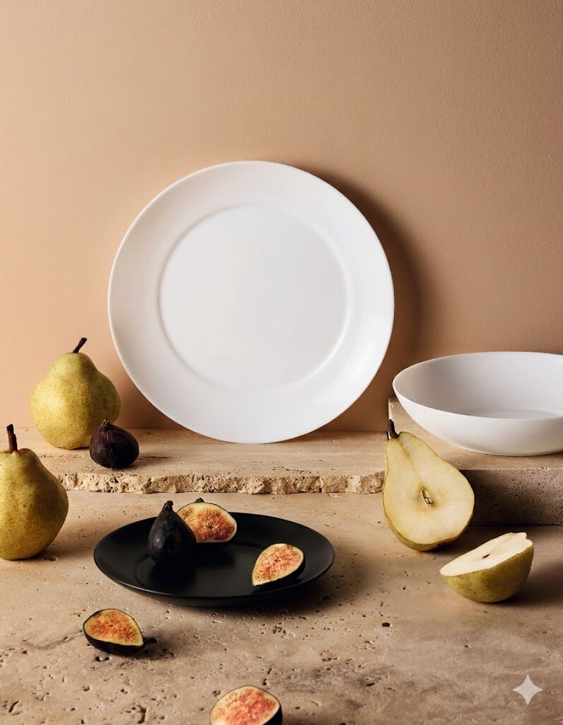 18-delni, sestavljen iz: 6x krožnik (25 cm), 6x jušni krožnik (20 cm), 6x desertni krožnik (18 cm), bela, črna, opalno steklo, primerno za pomivalni stroj in mikrovalovno pečico